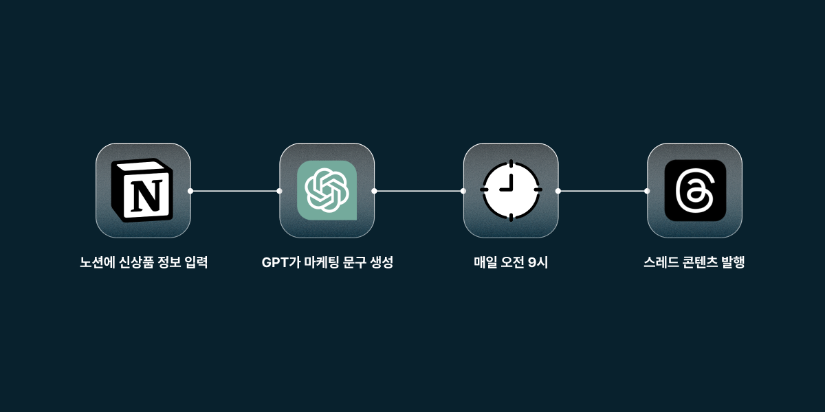 예를 들어 매주 신상품 소식을 SNS에 올려야 하는 쇼핑몰 운영자라면 어떨까요. Notion에 상품 내용을 입력하면 → ChatGPT가 마케팅 문구를 만들고 → 매일 오전 9시 스레드에 이번 주 신상품 소식 콘텐츠가 자동으로 발행됩니다. 이 흐름 전체가 코드 한 줄 없이, 자동화툴 서비스를 연결하는 것만으로 완성됩니다.